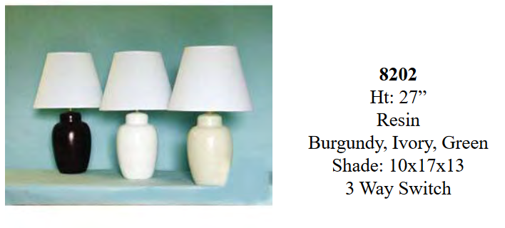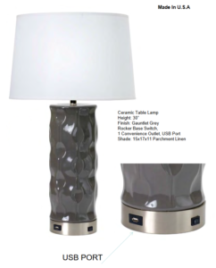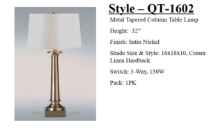 All table and desk lamps rated to accept 100 to 150-watt bulbs. Table lamps feature Type “A” medium base